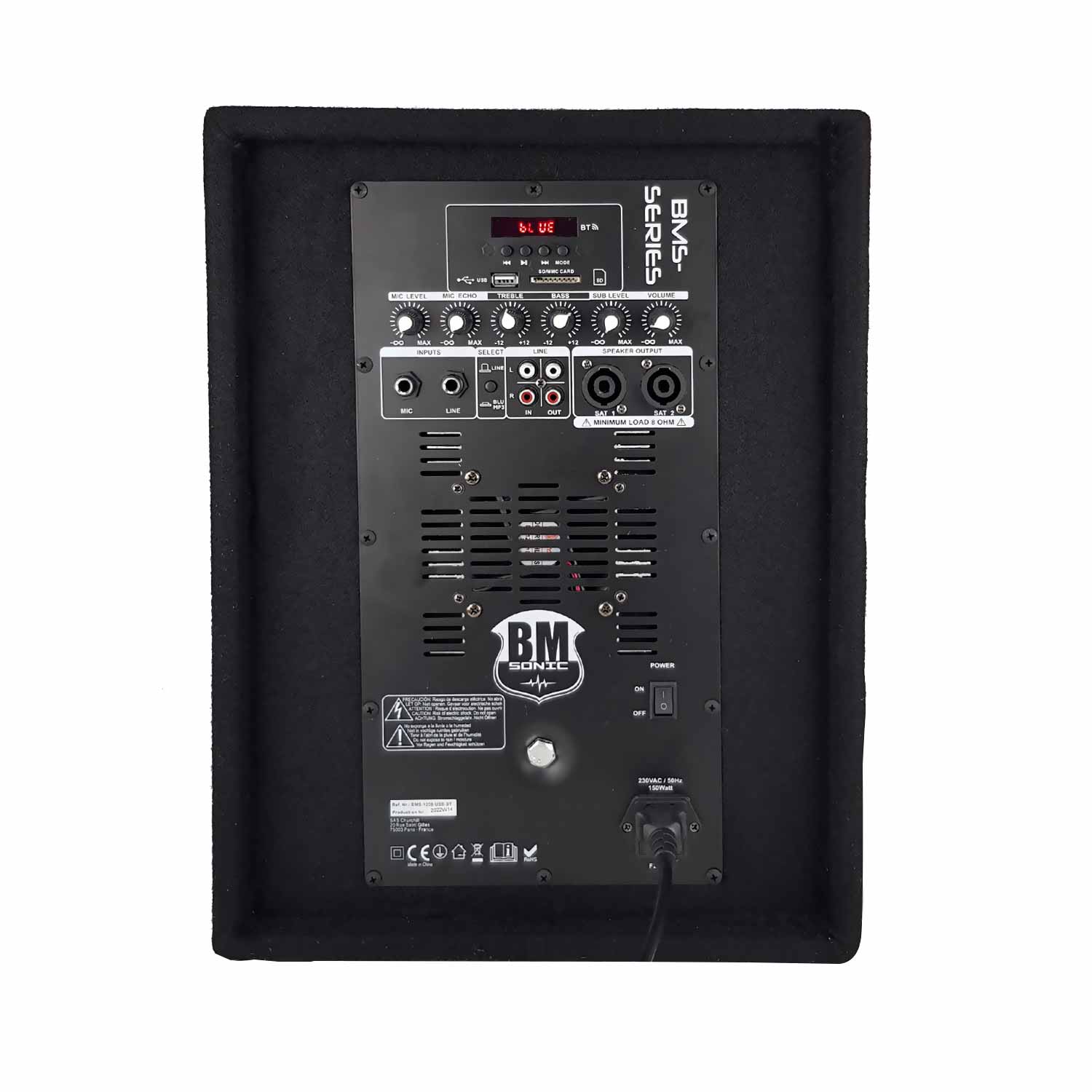 O subwoofer monta um woofer de 12″ e está equipado com ligação Bluetooth, leitor SD/USB, controlo remoto, controlo dos agudos/baixos e do volume, bem como controlo do volume e do eco da entrada do microfone. Possui também duas pegas grandes para facilitar o transporte, um copo para montagem em suporte e está revestido com um tecido particularmente resistente.