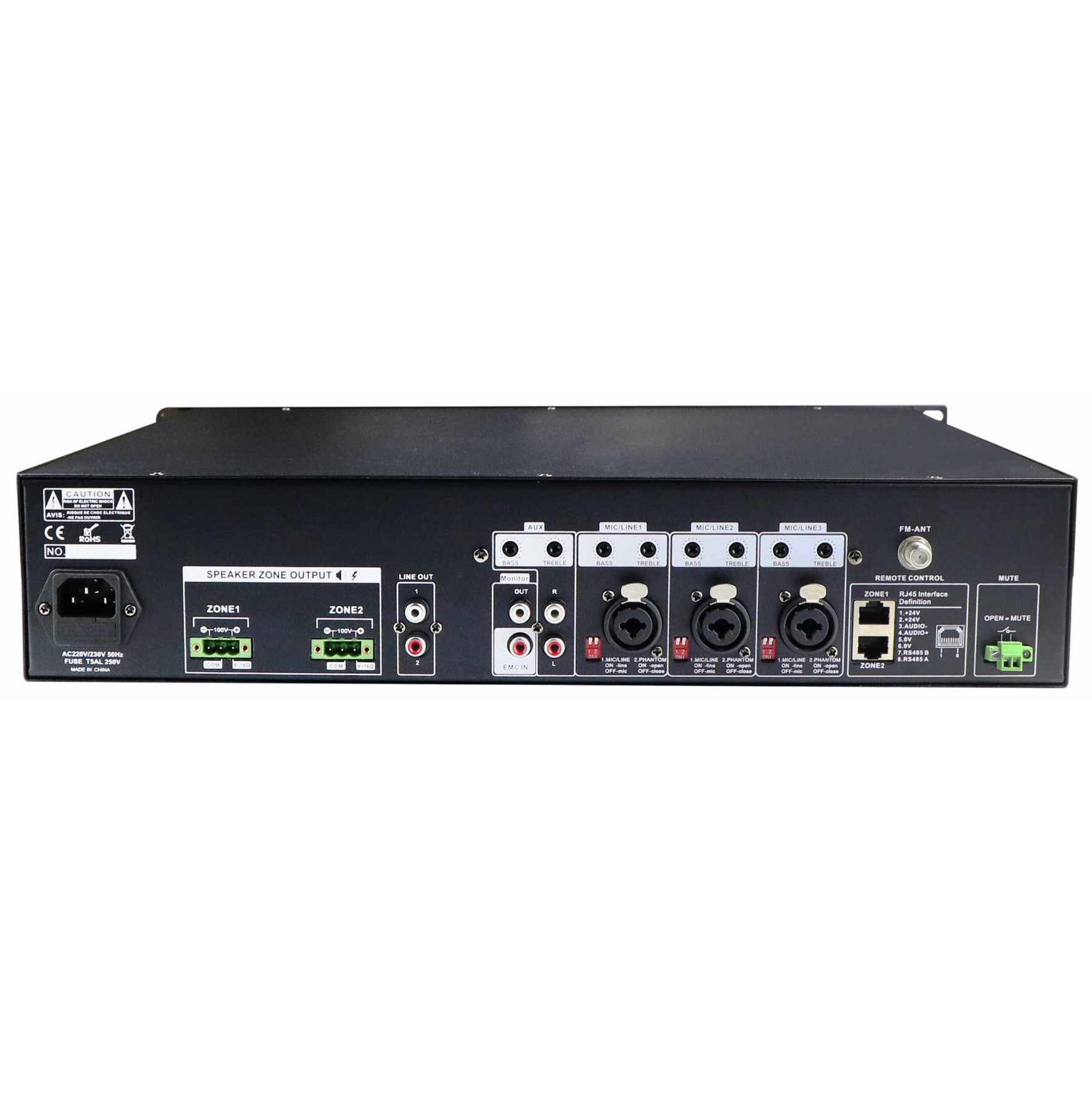 Amplificador PA profissional com 100V mas também com capacidade para sinais de 8 -16Ohm. Dispõe de 2 zonas de matriz para gerir 4 sinais de linha e 3 microfones. O módulo multimédia permite a reprodução de MP3 via USB, cartão TF ou ligação Bluetooth e incorpora um sofisticado rádio FM de última geração e um recetor DAB+. Gere o sinal de alarme, o efeito de sirene e o modo silencioso. Cada entrada é ajustável de forma independente para tons altos e baixos. A potência máxima é de 480 W por zona.
