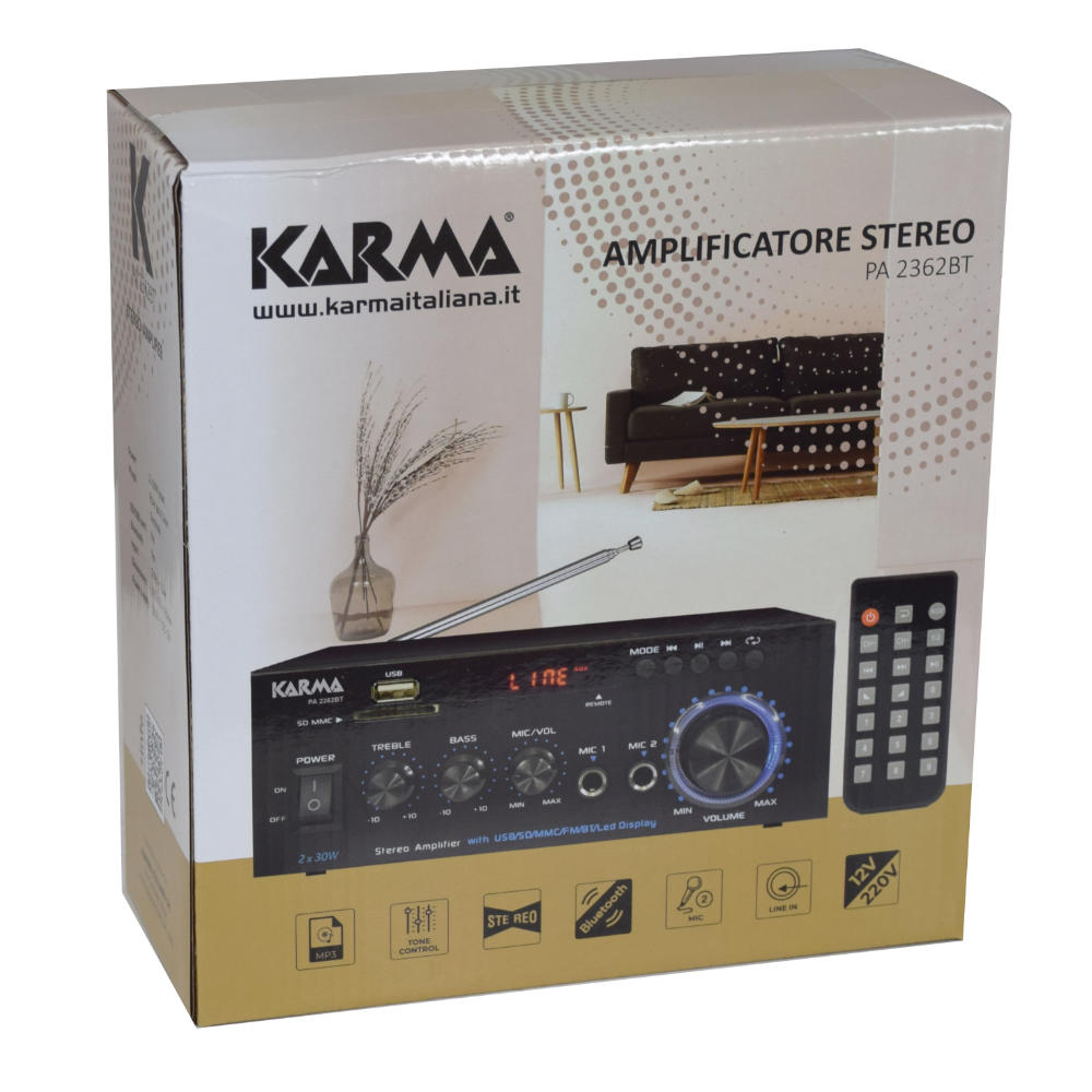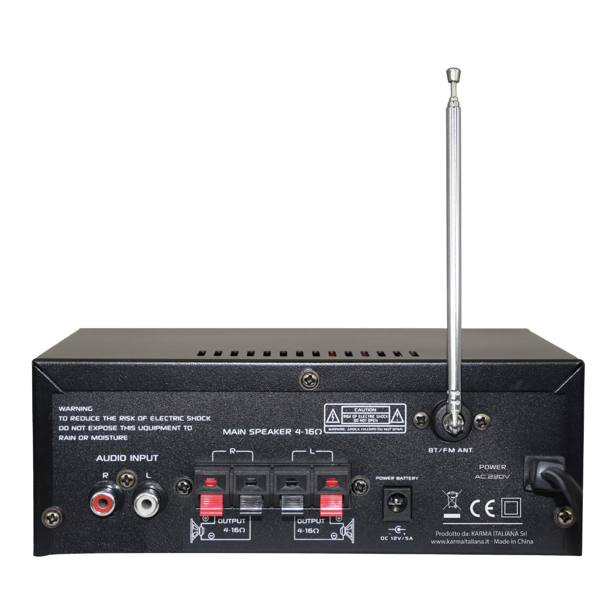 Amplificador stereo pequeno projetado para uso doméstico e pequenas lojas. A tomada traseira permite a conexão de 2 colunas de 30W. O módulo multimédia permite reproduzir músicas via SD, USB ou via bluetooth. Projetado para uso em lojas, recepções ou residências.