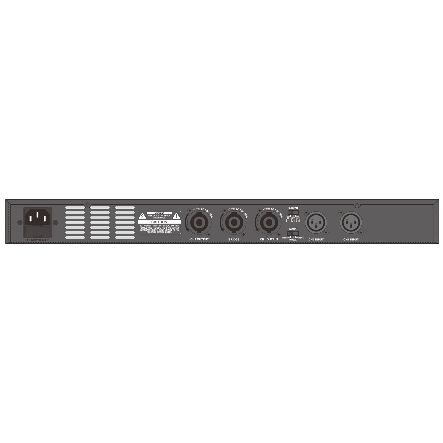 Inclui um seletor X-OVER no painel traseiro para corte de frequências e, no painel frontal, apresenta controlos de volume independentes e indicadores LED de nível, sobrecarga e bloqueio/proteção.