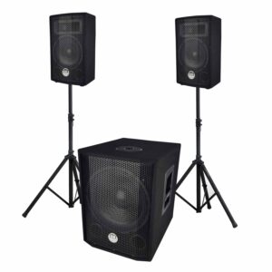 É composto por um subwoofer amplificado de 600 W, dois satélites de 200 W com suportes reguláveis em altura (100 a 160 cm) fornecidos numa prática mala.