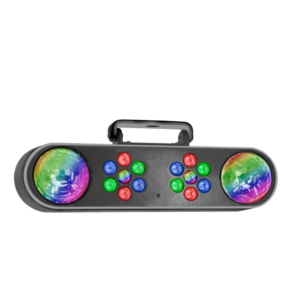 Compacto, leve e extremamente eficaz, este sistema de luz é ideal para festas, eventos e animação itinerante. É composto por um suporte em tripé e uma barra que integra 2 projetores LED RGB e 2 efeitos de esfera rotativa, garantindo um espetáculo visual completo.