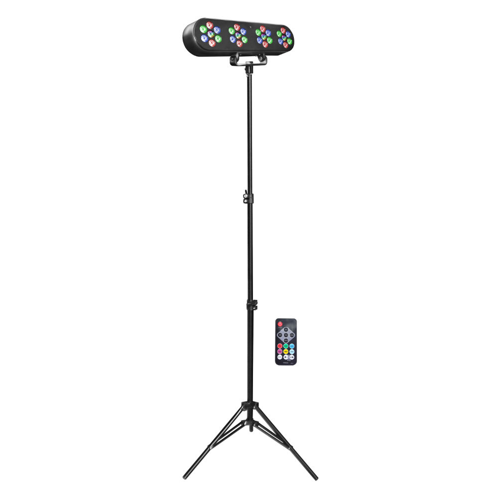 A estrutura inclui um tripé resistente e uma barra equipada com 4 projetores LED RGB, totalizando 28 LEDs de alta intensidade. Basta ligar o cabo de alimentação a uma tomada doméstica e pressionar o botão traseiro para começar a desfrutar dos efeitos.