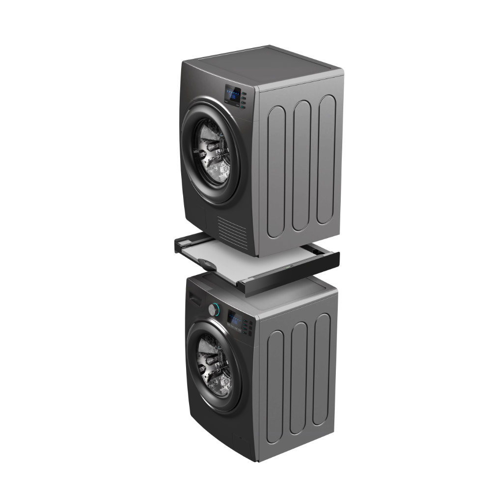 O kit de empilhamento fixo universal permite poupar espaço, é muito estável e permite-lhe colocar a sua roupa por cima, graças a uma estrutura em tecnopolímero ultra-resistente e reforçada com 4 arestas rígidas. Tem uma cinta de segurança de 6 metros com fivela metálica incluída e a possibilidade de fixar o kit à máquina de lavar com parafusos se o teto for de madeira. Possui também uma prateleira de madeira com um sistema de calhas metálicas deslizantes e uma pega integrada.