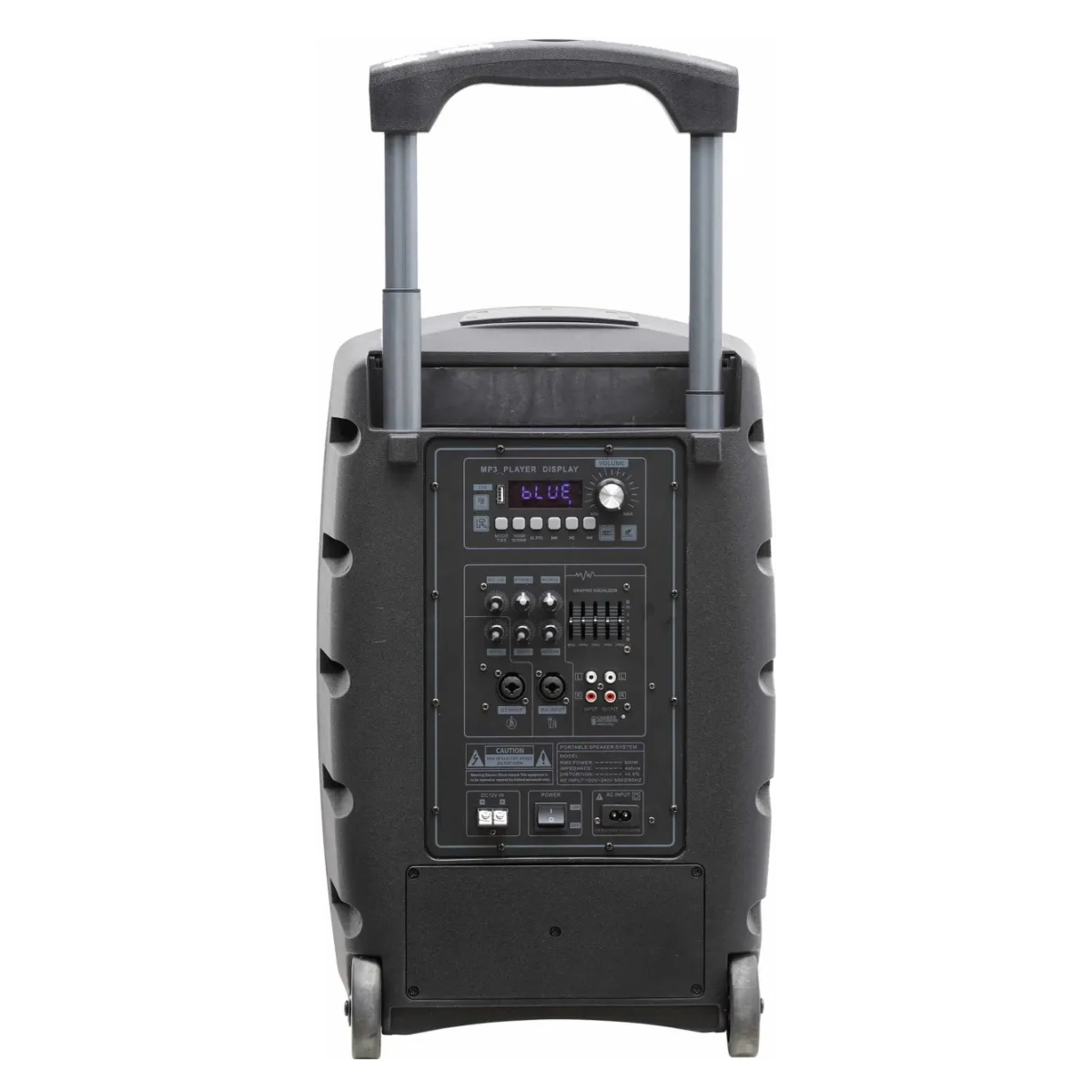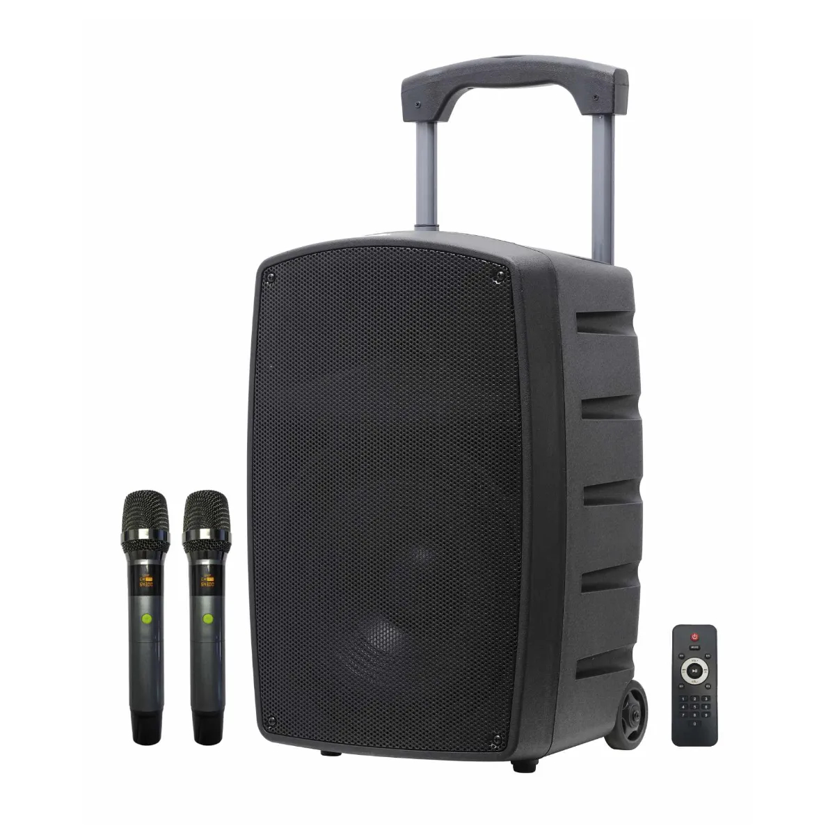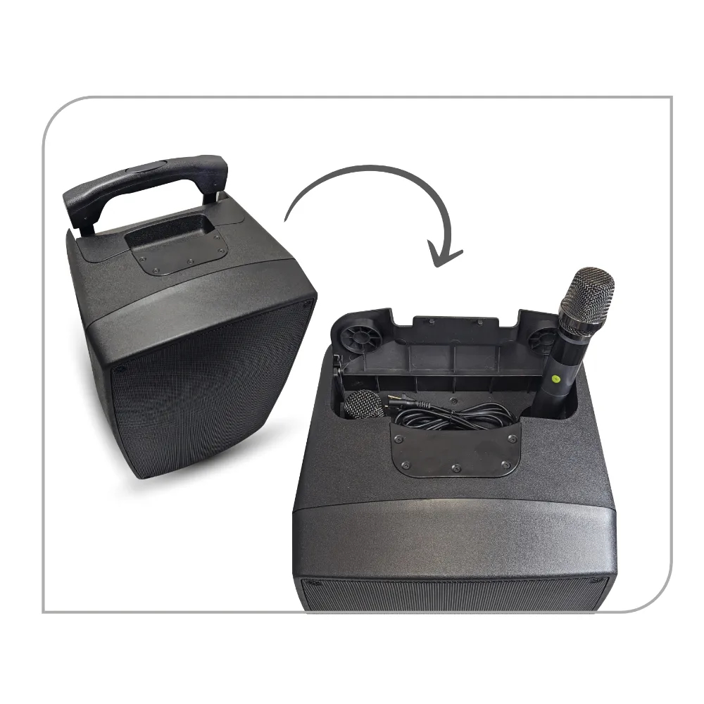 Coluna amplificada profissional equipada com microfone duplo rádio UHF e controle remoto. A bateria interna é recarregada através de uma tomada elétrica doméstica. O painel de controle permite a conexão de um microfone com fio e um instrumento musical através de conectores combo XLR-6,3mm