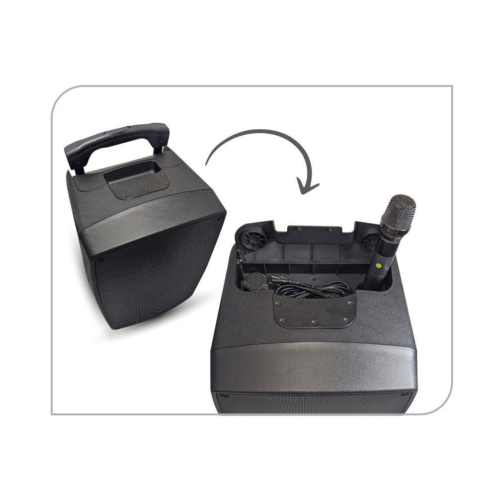 Esta coluna profissional amplificada de 15″ oferece um som potente e versátil, ideal para eventos, apresentações e uso profissional. Conta com bateria interna recarregável através de tomada doméstica ou 12V, além de dois radiomicrofones UHF e telecomando para maior praticidade.