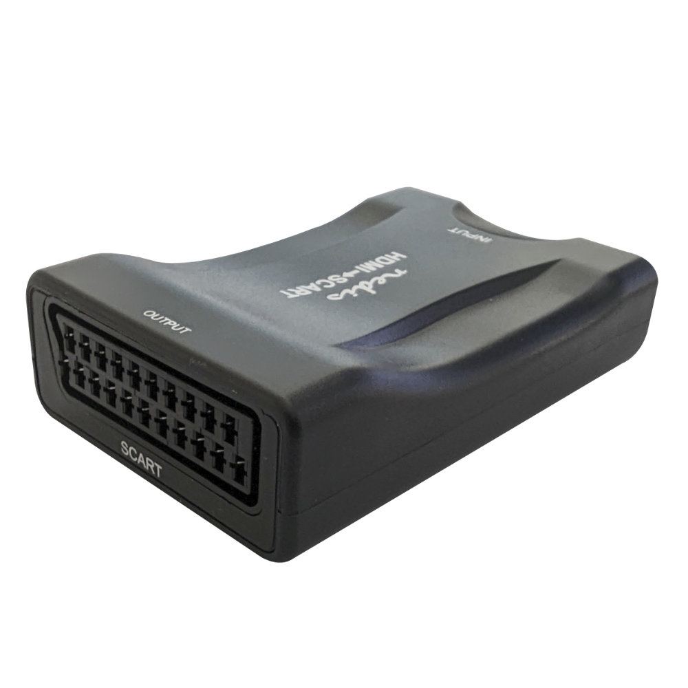 Adaptador áudio/vídeo capaz de converter sinais HDMI provenientes de um descodificador ou de outros equipamentos com saída HDMI para formato SCART, tornando-os compatíveis com televisores ou videogravadores mais antigos.