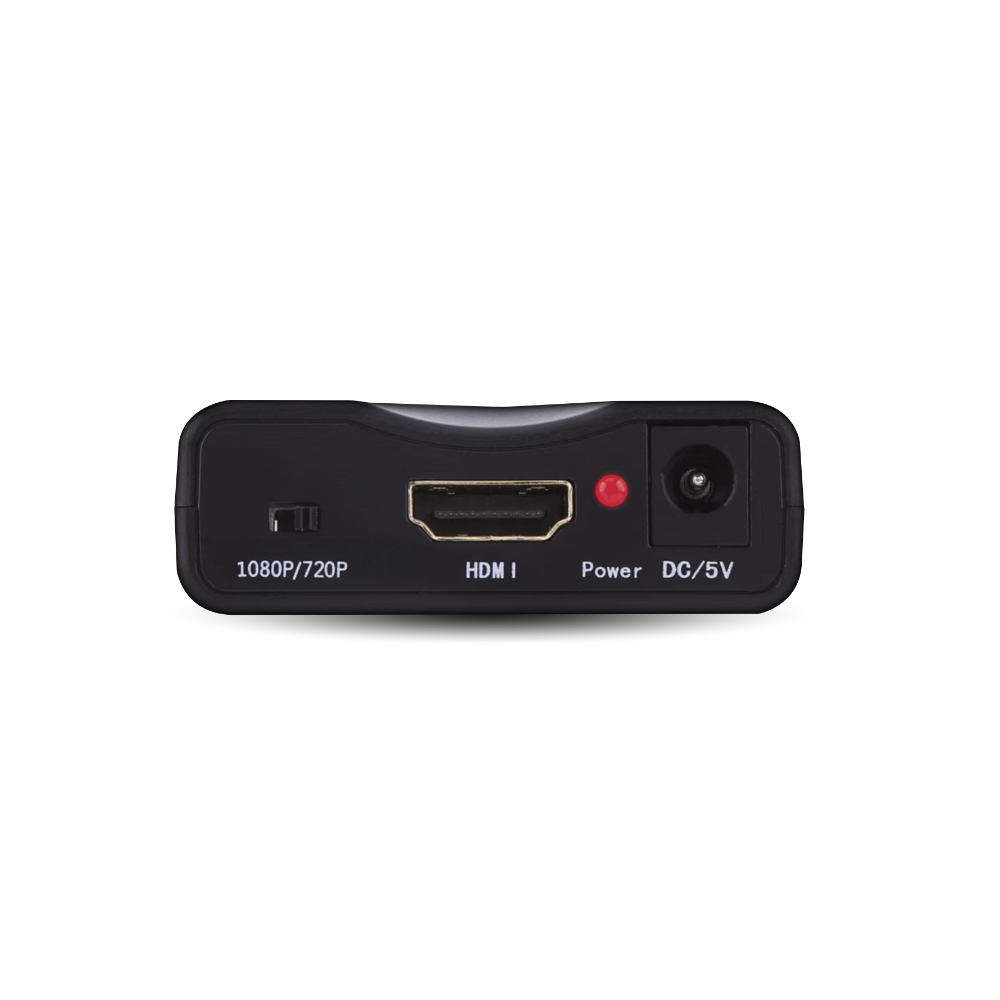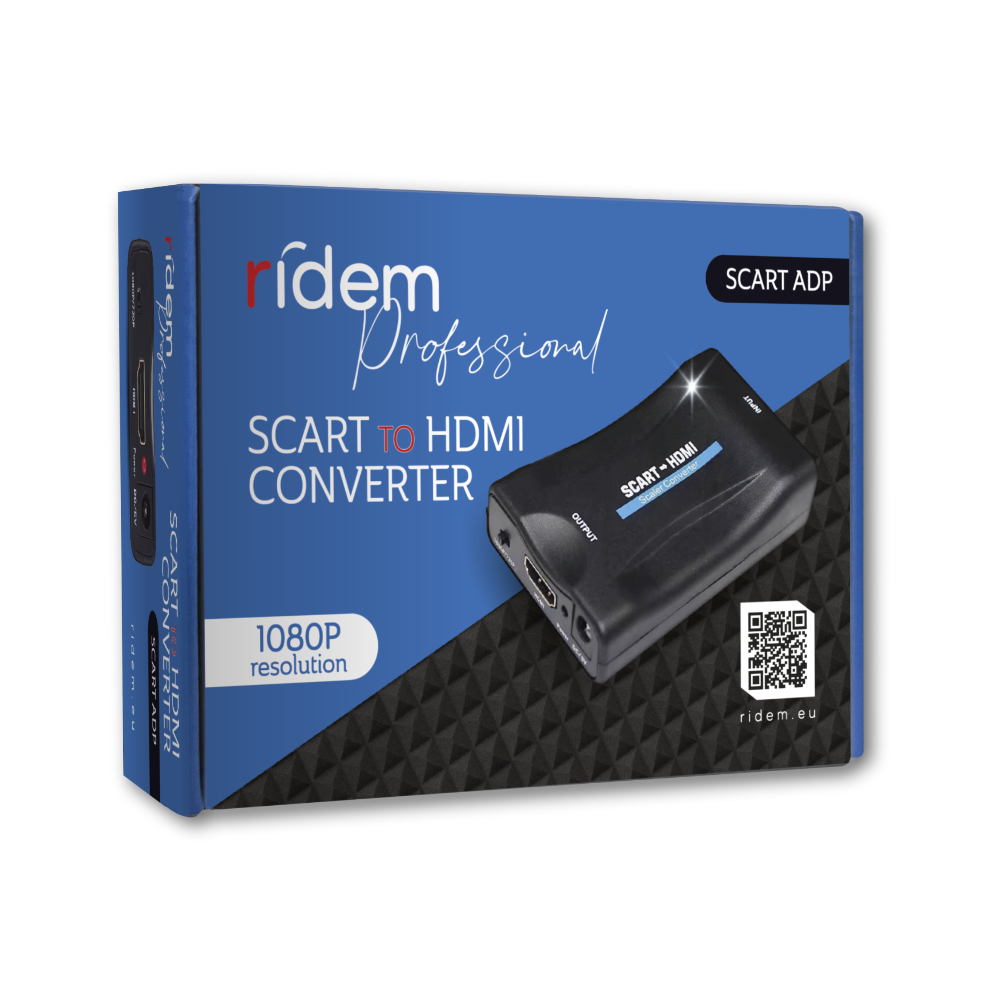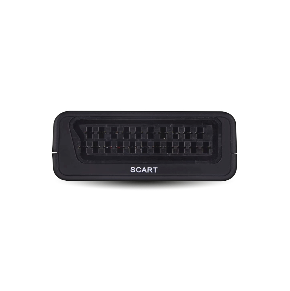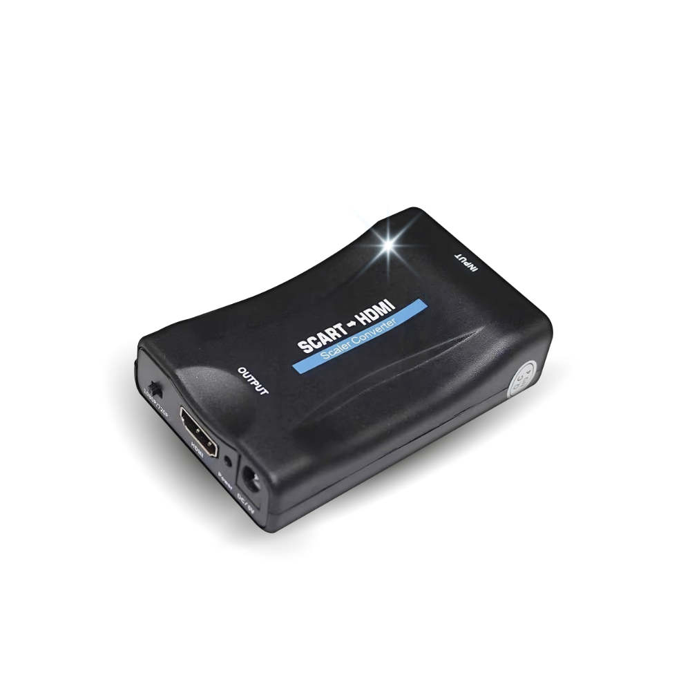 Adaptador áudio-vídeo capaz de converter um sinal SCART antigo em formato HDMI compatível com os televisores actuais. Possui um seletor para resolução de 720P ou 1080P e pode ser alimentado a partir de uma tomada USB comum com o cabo fornecido. Este acessório permite utilizar equipamentos antigos, como gravadores de vídeo, câmaras ou descodificadores, que apenas dispunham de tomadas SCART e que hoje não seriam utilizáveis em monitores ou ecrãs de televisão normais.