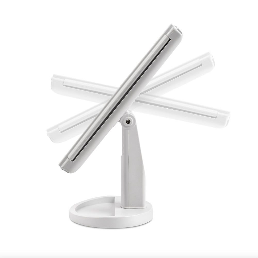 Enalteça a sua beleza com o Stupenda Make-up. Este espelho de maquilhagem oferece a máxima versatilidade: uma visão normal 1x para a aparência geral e ampliações 2x e 3x para cada detalhe do seu rosto. Equipado com iluminação LED, cria a atmosfera perfeita para garantir que a sua maquilhagem brilhe a qualquer momento do dia. Diga adeus às preocupações com as baterias! O Stupenda Make-up pode ser utilizado com 4 pilhas ministilo ou via USB.