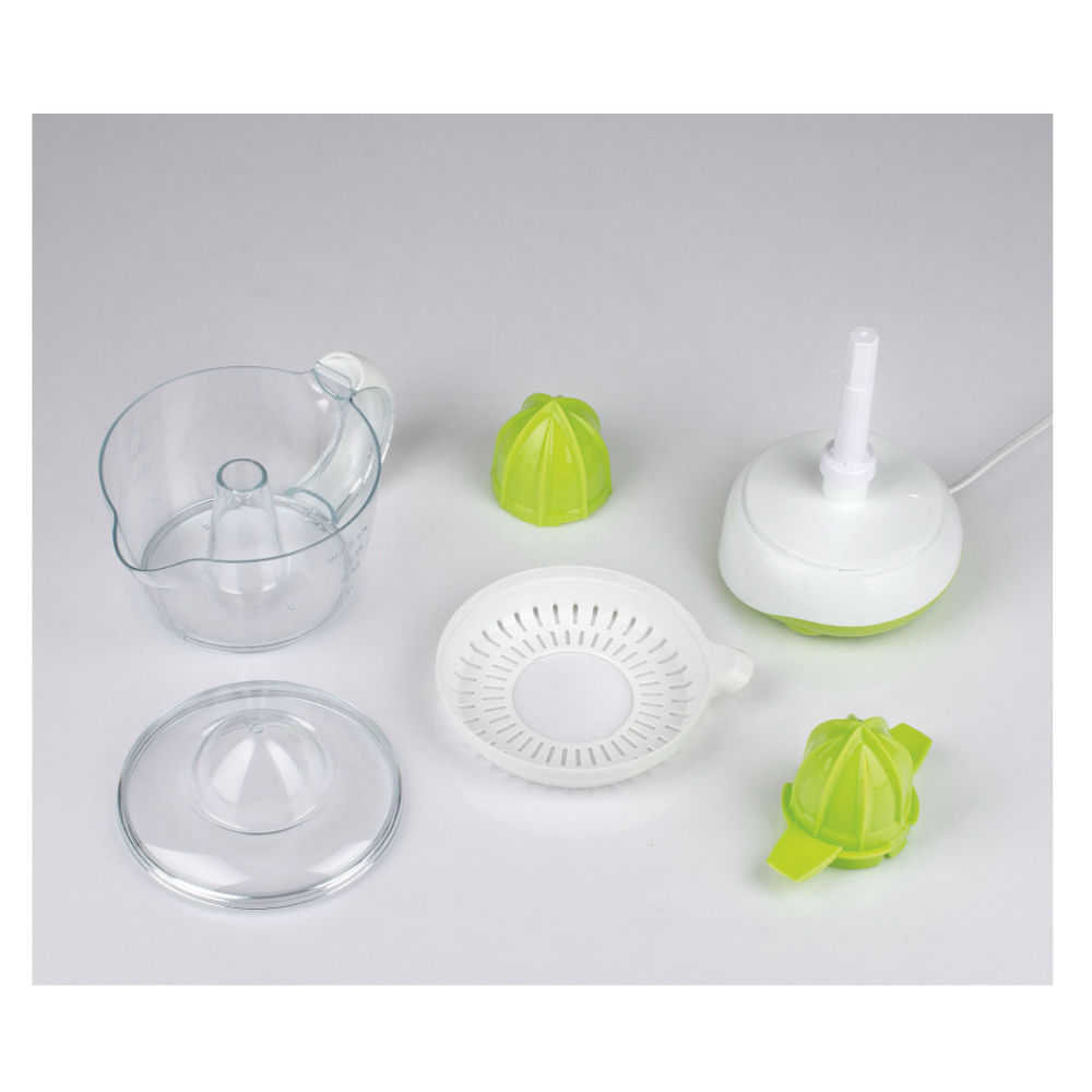 Totalmente desmontável para fácil limpeza, o aparelho possui uma capacidade de sumo de 700 ml e inclui um copo medidor transparente, garantindo máxima comodidade na utilização.