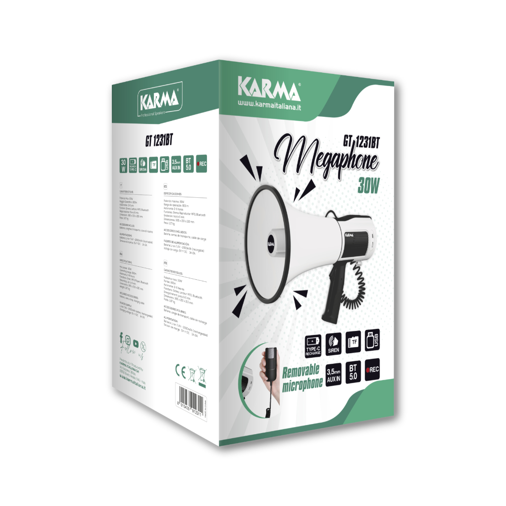 Com uma potência de 30W, é audível até 800 metros de distância em espaços abertos. A bateria recarregável garante uma longa autonomia e pode ser carregada através do conector USB Tipo-C, quer diretamente na bateria, quer na lateral do megafone.