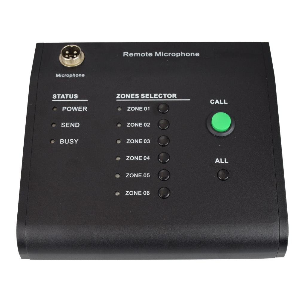 Microfone de mesa tipo paging capaz de fazer anúncios em 6 zonas diferentes.