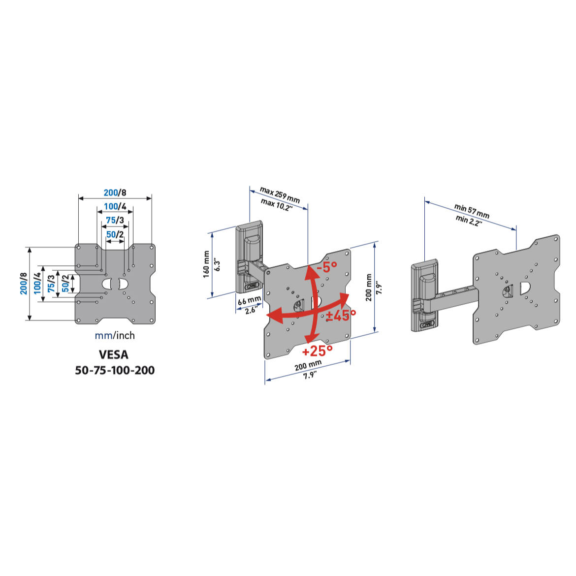 O ER200 é um suporte com braço adequado para todas as TVs com furos VESA 75-100-200 mm, o braço permite afastar a tela da parede e incliná-la vertical e horizontalmente até 45° (dependendo do tamanho da TV ).