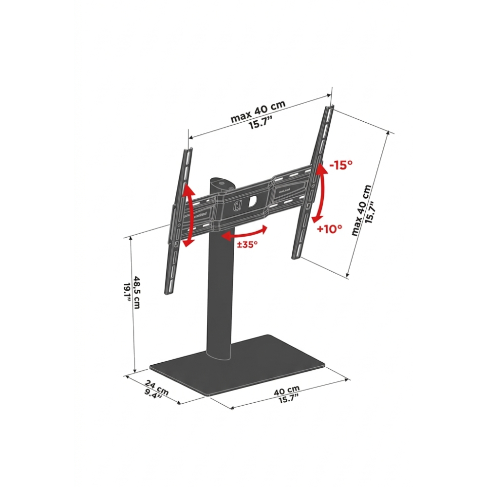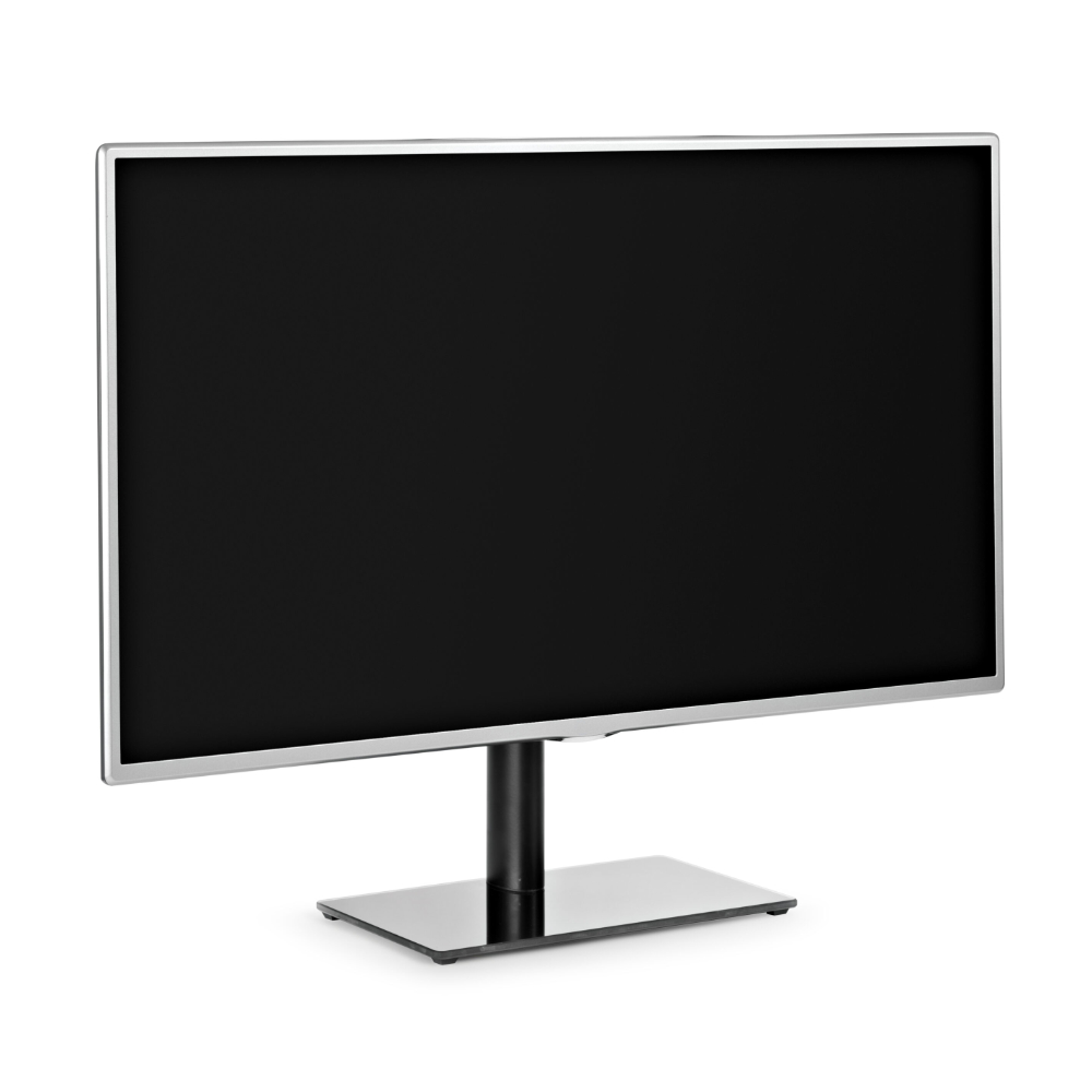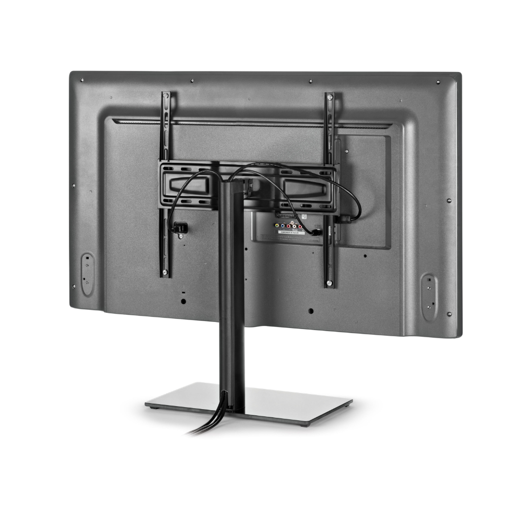 A elegante base de vidro temperado garante estabilidade ao produto, a coluna de alumínio é equipada com um prático sistema de ocultação de fios dentro do qual pode passar todos os cabos para criar um ambiente de TV arrumado e moderno.